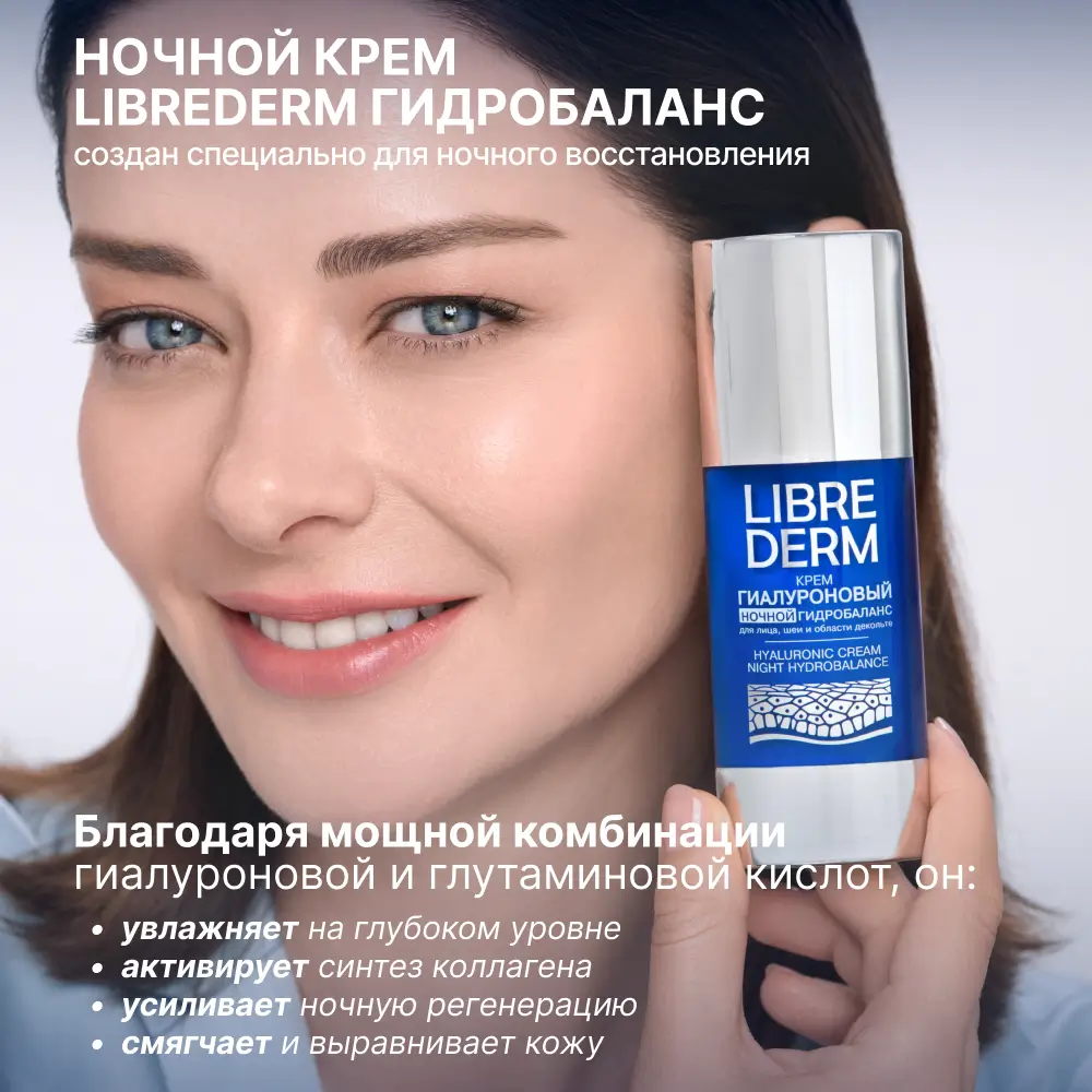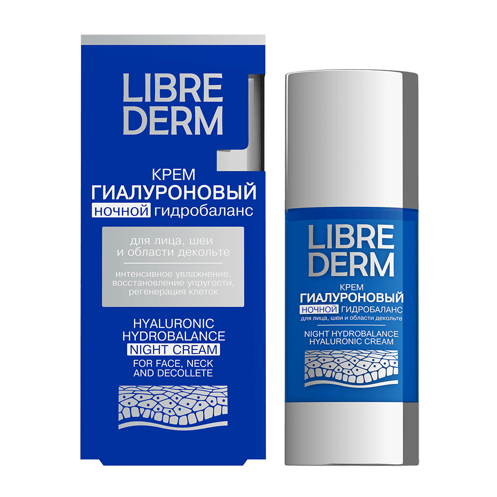 Ночью в коже запускаются восстановительные процессы и одновременно она становится более восприимчивой к уходовым средствам. Поэтому формула ночного крема гидробаланс оптимизирована под ночные часы. В основе – комбинация двух активных компонентов – низкомолекулярной гиалуроновой кислоты и глютаминовой кислоты в высокой концентрации, которые быстро проникают в глубокие слои кожи, дарят интенсивное увлажнение и защищают от преждевременного старения. Ночной крем с легкой текстурой быстро впитывается, не забивает поры и не оставляет следов на подушке. Утром кожа выглядит свежей, отдохнувшей и сияющей. Для увлажнения в режиме 24/7 рекомендуем дополнить уход гиалуроновым кремом и сывороткой LIBREDERM.