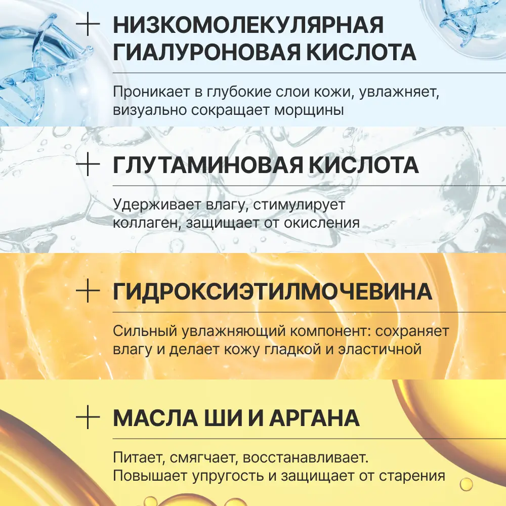 Комплексный уход, направленный на увлажнение, питание и восстановление кожи с закреплением результата.
